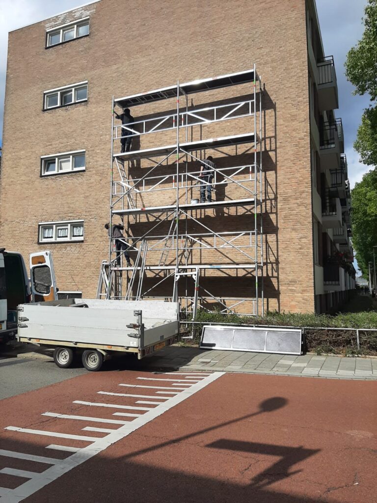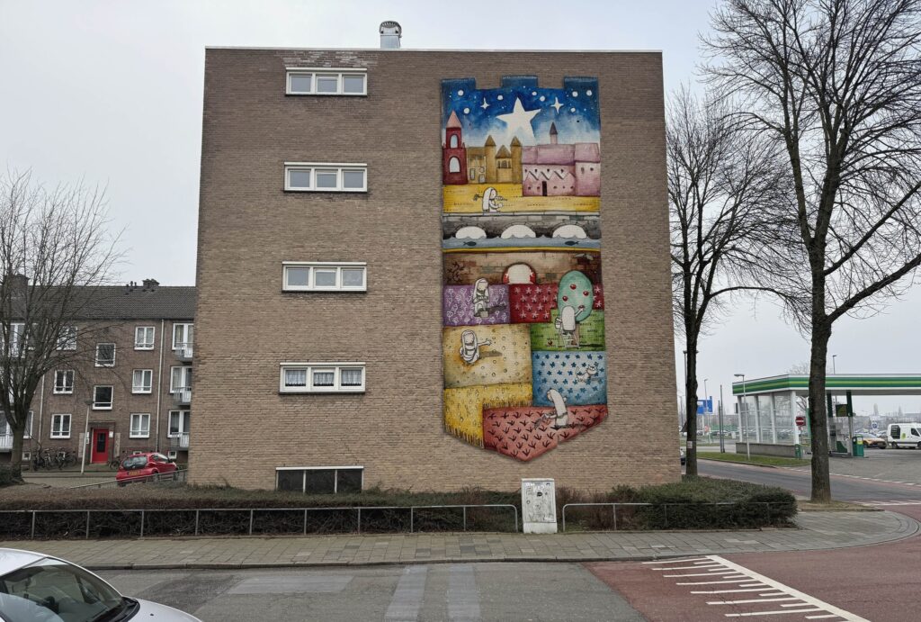 De kunstenaar Dave de Leeuw brengt op het appartementencomplex een grote muurschildering aan in de vorm van een groot vaandel.